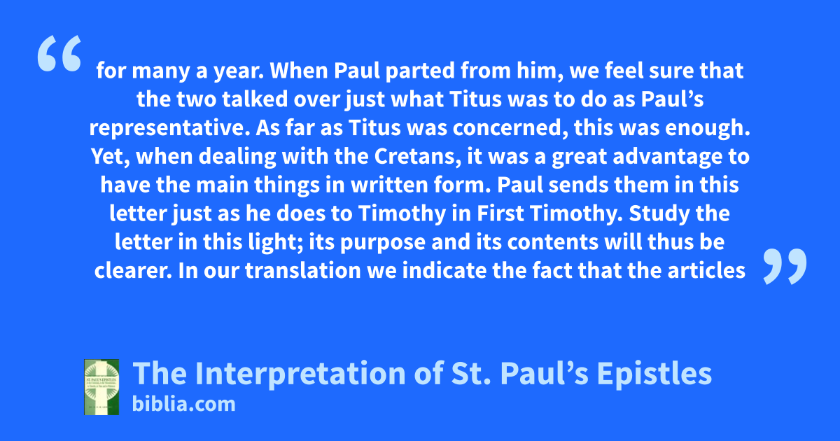 for many a year. When Paul parted from him, we feel sure that the two talked over just what Titus was to do as Paul’s representative. As far as Titus was concerned, this was enough. Yet, when dealing with the Cretans, it was a great advantage to have the main things in written form. Paul sends them in this letter just as he does to Timothy in First Timothy. Study the letter in this light; its purpose and its contents will thus be clearer. In our translation we indicate the fact that the articles