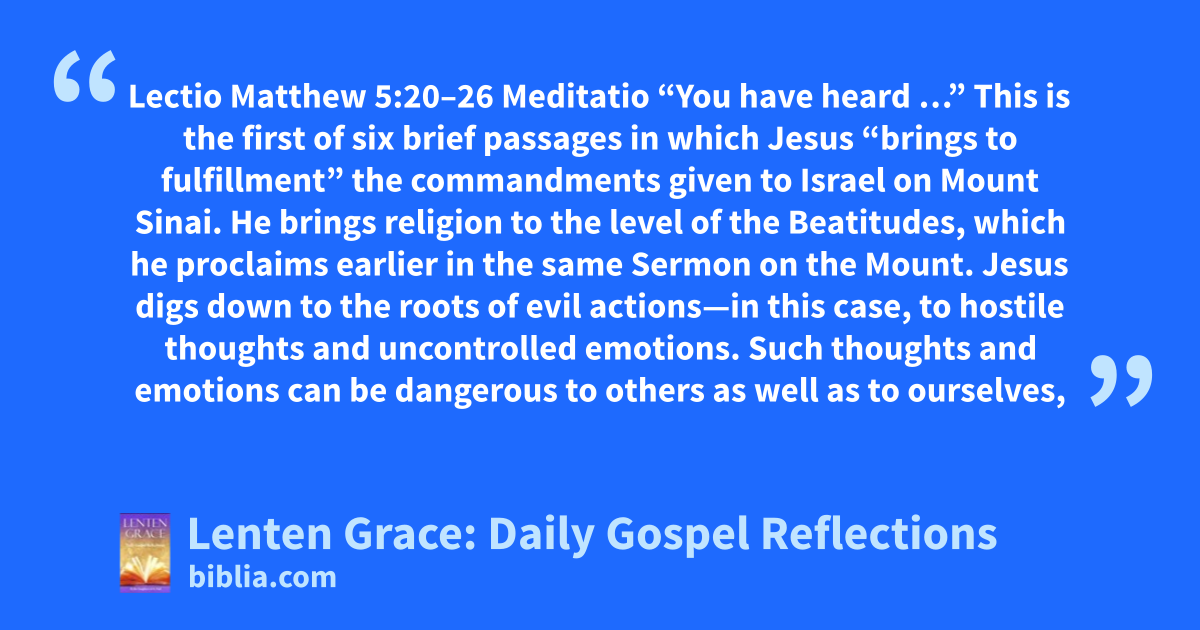 Lectio Matthew 5:20–26 Meditatio “You have heard …” This is the first of six brief passages in which Jesus “brings to fulfillment” the commandments given to Israel on Mount Sinai. He brings religion to the level of the Beatitudes, which he proclaims earlier in the same Sermon on the Mount. Jesus digs down to the roots of evil actions—in this case, to hostile thoughts and uncontrolled emotions. Such thoughts and emotions can be dangerous to others as well as to ourselves,