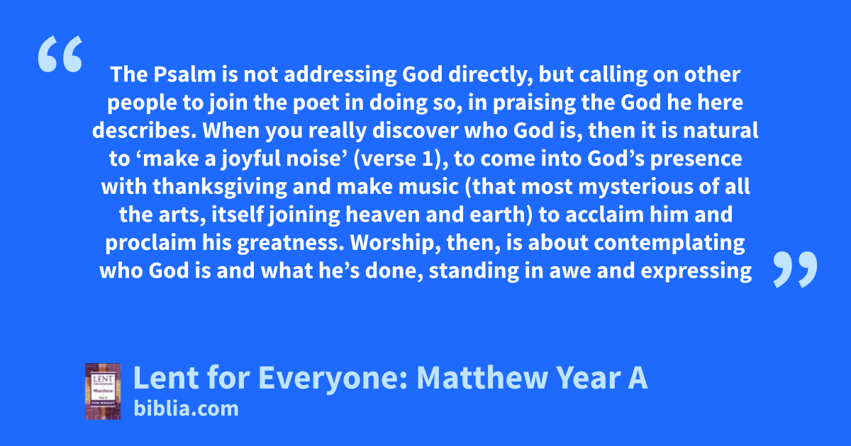 The Psalm is not addressing God directly, but calling on other people to join the poet in doing so, in praising the God he here describes. When you really discover who God is, then it is natural to ‘make a joyful noise’ (verse 1), to come into God’s presence with thanksgiving and make music (that most mysterious of all the arts, itself joining heaven and earth) to acclaim him and proclaim his greatness. Worship, then, is about contemplating who God is and what he’s done, standing in awe and expressing