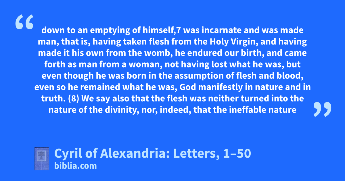 down to an emptying of himself,7 was incarnate and was made man, that is, having taken flesh from the Holy Virgin, and having made it his own from the womb, he endured our birth, and came forth as man from a woman, not having lost what he was, but even though he was born in the assumption of flesh and blood, even so he remained what he was, God manifestly in nature and in truth. (8) We say also that the flesh was neither turned into the nature of the divinity, nor, indeed, that the ineffable nature