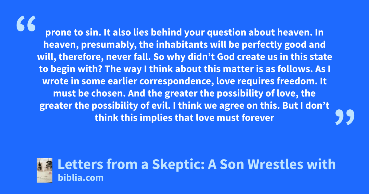 prone to sin. It also lies behind your question about heaven. In heaven, presumably, the inhabitants will be perfectly good and will, therefore, never fall. So why didn’t God create us in this state to begin with? The way I think about this matter is as follows. As I wrote in some earlier correspondence, love requires freedom. It must be chosen. And the greater the possibility of love, the greater the possibility of evil. I think we agree on this. But I don’t think this implies that love must forever