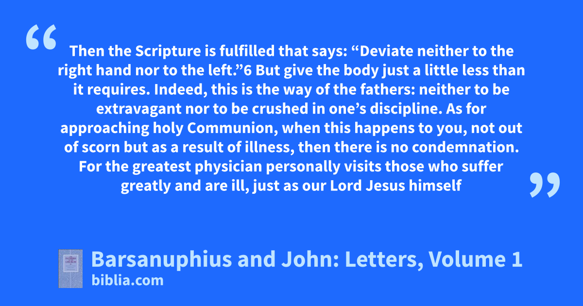 Then the Scripture is fulfilled that says: “Deviate neither to the right hand nor to the left.”6 But give the body just a little less than it requires. Indeed, this is the way of the fathers: neither to be extravagant nor to be crushed in one’s discipline. As for approaching holy Communion, when this happens to you, not out of scorn but as a result of illness, then there is no condemnation. For the greatest physician personally visits those who suffer greatly and are ill, just as our Lord Jesus himself