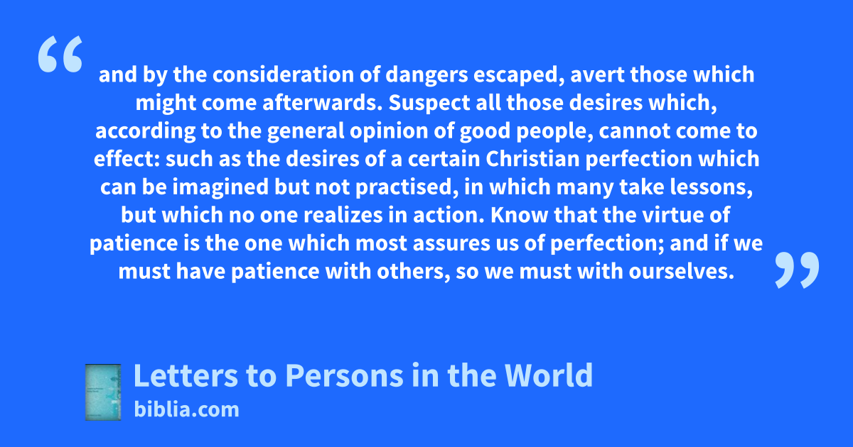 and by the consideration of dangers escaped, avert those which might come afterwards. Suspect all those desires which, according to the general opinion of good people, cannot come to effect: such as the desires of a certain Christian perfection which can be imagined but not practised, in which many take lessons, but which no one realizes in action. Know that the virtue of patience is the one which most assures us of perfection; and if we must have patience with others, so we must with ourselves.
