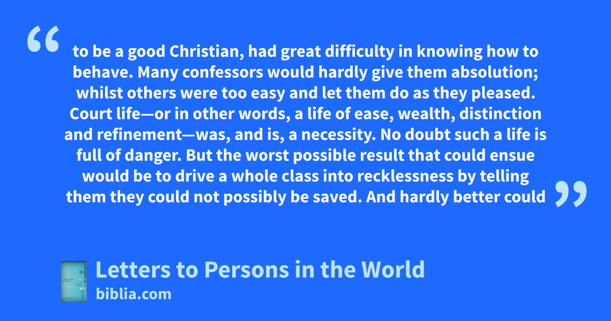 to be a good Christian, had great difficulty in knowing how to behave. Many confessors would hardly give them absolution; whilst others were too easy and let them do as they pleased. Court life—or in other words, a life of ease, wealth, distinction and refinement—was, and is, a necessity. No doubt such a life is full of danger. But the worst possible result that could ensue would be to drive a whole class into recklessness by telling them they could not possibly be saved. And hardly better could