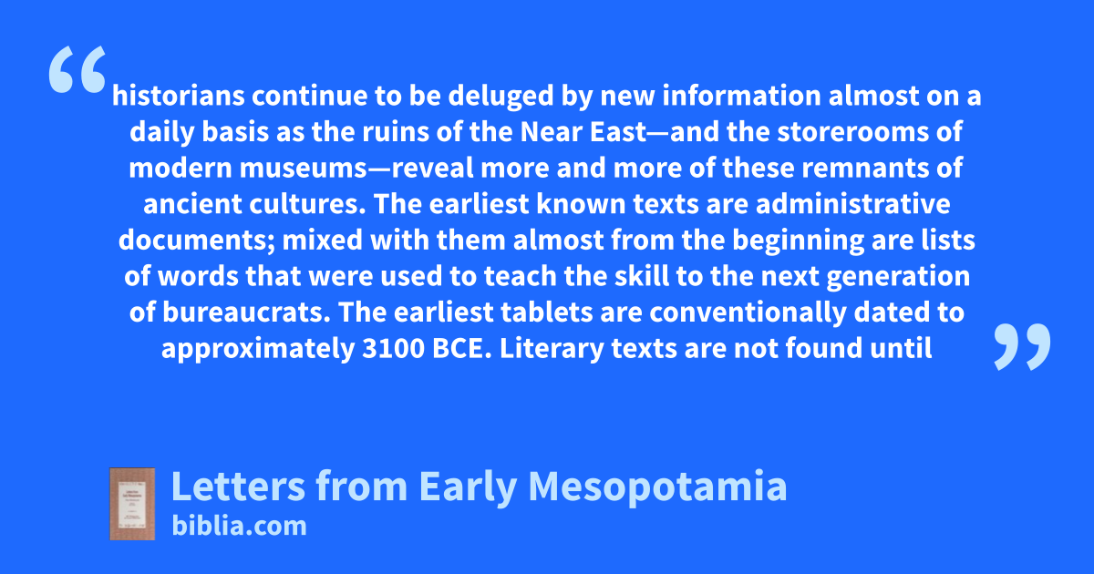 historians continue to be deluged by new information almost on a daily basis as the ruins of the Near East—and the storerooms of modern museums—reveal more and more of these remnants of ancient cultures. The earliest known texts are administrative documents; mixed with them almost from the beginning are lists of words that were used to teach the skill to the next generation of bureaucrats. The earliest tablets are conventionally dated to approximately 3100 BCE. Literary texts are not found until