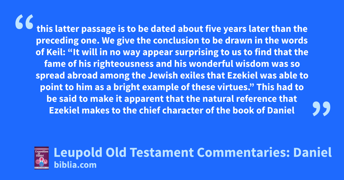 this latter passage is to be dated about five years later than the preceding one. We give the conclusion to be drawn in the words of Keil: “It will in no way appear surprising to us to find that the fame of his righteousness and his wonderful wisdom was so spread abroad among the Jewish exiles that Ezekiel was able to point to him as a bright example of these virtues.” This had to be said to make it apparent that the natural reference that Ezekiel makes to the chief character of the book of Daniel
