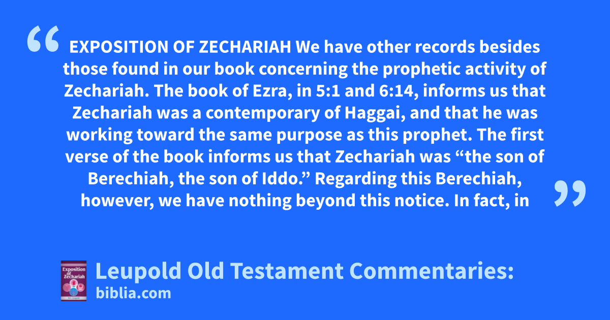 EXPOSITION OF ZECHARIAH We have other records besides those found in our book concerning the prophetic activity of Zechariah. The book of Ezra, in 5:1 and 6:14, informs us that Zechariah was a contemporary of Haggai, and that he was working toward the same purpose as this prophet. The first verse of the book informs us that Zechariah was “the son of Berechiah, the son of Iddo.” Regarding this Berechiah, however, we have nothing beyond this notice. In fact, in