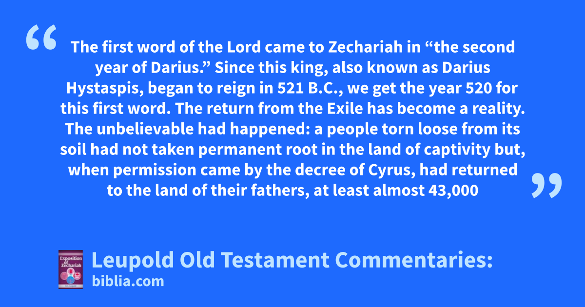 The first word of the Lord came to Zechariah in “the second year of Darius.” Since this king, also known as Darius Hystaspis, began to reign in 521 B.C., we get the year 520 for this first word. The return from the Exile has become a reality. The unbelievable had happened: a people torn loose from its soil had not taken permanent root in the land of captivity but, when permission came by the decree of Cyrus, had returned to the land of their fathers, at least almost 43,000