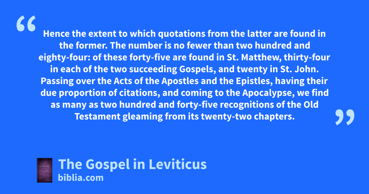 Hence the extent to which quotations from the latter are found in the former. The number is no fewer than two hundred and eighty-four: of these forty-five are found in St. Matthew, thirty-four in each of the two succeeding Gospels, and twenty in St. John. Passing over the Acts of the Apostles and the Epistles, having their due proportion of citations, and coming to the Apocalypse, we find as many as two hundred and forty-five recognitions of the Old Testament gleaming from its twenty-two chapters.