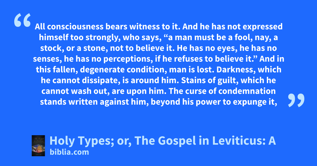All consciousness bears witness to it. And he has not expressed himself too strongly, who says, “a man must be a fool, nay, a stock, or a stone, not to believe it. He has no eyes, he has no senses, he has no perceptions, if he refuses to believe it.” And in this fallen, degenerate condition, man is lost. Darkness, which he cannot dissipate, is around him. Stains of guilt, which he cannot wash out, are upon him. The curse of condemnation stands written against him, beyond his power to expunge it,
