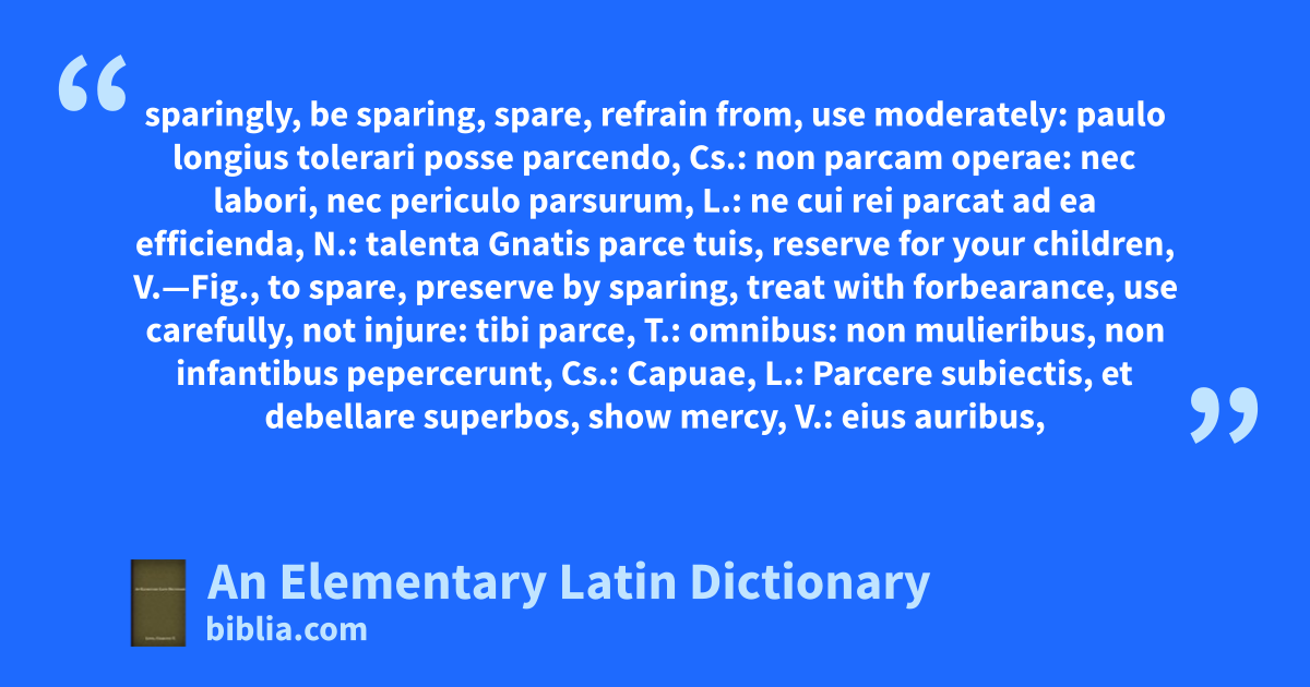 sparingly, be sparing, spare, refrain from, use moderately: paulo longius tolerari posse parcendo, Cs.: non parcam operae: nec labori, nec periculo parsurum, L.: ne cui rei parcat ad ea efficienda, N.: talenta Gnatis parce tuis, reserve for your children, V.—Fig., to spare, preserve by sparing, treat with forbearance, use carefully, not injure: tibi parce, T.: omnibus: non mulieribus, non infantibus pepercerunt, Cs.: Capuae, L.: Parcere subiectis, et debellare superbos, show mercy, V.: eius auribus,