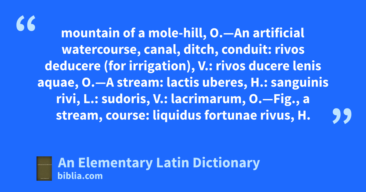 mountain of a mole-hill, O.—An artificial watercourse, canal, ditch, conduit: rivos deducere (for irrigation), V.: rivos ducere lenis aquae, O.—A stream: lactis uberes, H.: sanguinis rivi, L.: sudoris, V.: lacrimarum, O.—Fig., a stream, course: liquidus fortunae rivus, H.