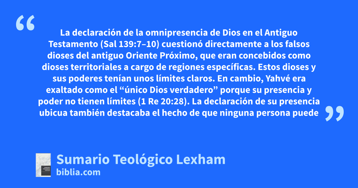 La declaración de la omnipresencia de Dios en el Antiguo Testamento (Sal 139:7–10) cuestionó directamente a los falsos dioses del antiguo Oriente Próximo, que eran concebidos como dioses territoriales a cargo de regiones específicas. Estos dioses y sus poderes tenían unos límites claros. En cambio, Yahvé era exaltado como el “único Dios verdadero” porque su presencia y poder no tienen límites (1 Re 20:28). La declaración de su presencia ubicua también destacaba el hecho de que ninguna persona puede