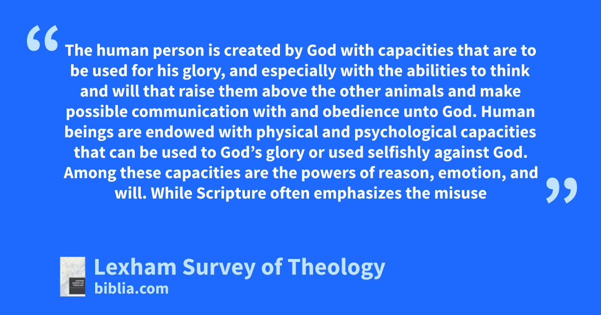 The human person is created by God with capacities that are to be used for his glory, and especially with the abilities to think and will that raise them above the other animals and make possible communication with and obedience unto God. Human beings are endowed with physical and psychological capacities that can be used to God’s glory or used selfishly against God. Among these capacities are the powers of reason, emotion, and will. While Scripture often emphasizes the misuse