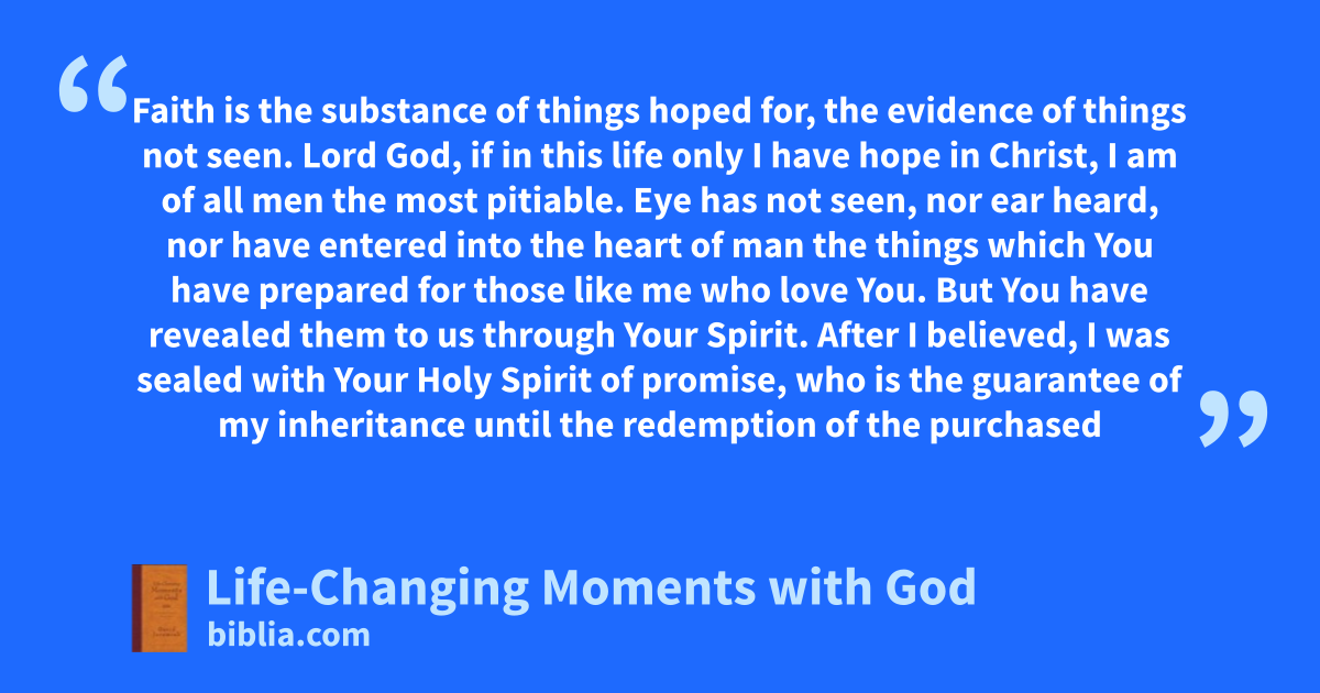 Faith is the substance of things hoped for, the evidence of things not seen. Lord God, if in this life only I have hope in Christ, I am of all men the most pitiable. Eye has not seen, nor ear heard, nor have entered into the heart of man the things which You have prepared for those like me who love You. But You have revealed them to us through Your Spirit. After I believed, I was sealed with Your Holy Spirit of promise, who is the guarantee of my inheritance until the redemption of the purchased