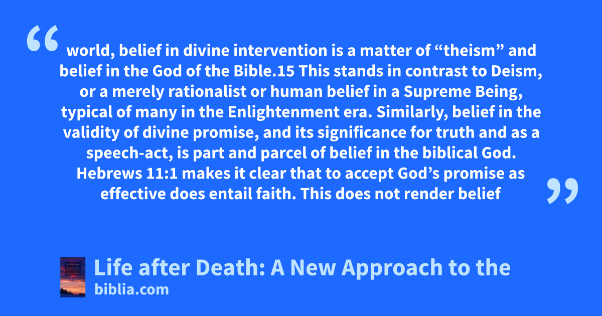 world, belief in divine intervention is a matter of “theism” and belief in the God of the Bible.15 This stands in contrast to Deism, or a merely rationalist or human belief in a Supreme Being, typical of many in the Enlightenment era. Similarly, belief in the validity of divine promise, and its significance for truth and as a speech-act, is part and parcel of belief in the biblical God. Hebrews 11:1 makes it clear that to accept God’s promise as effective does entail faith. This does not render belief