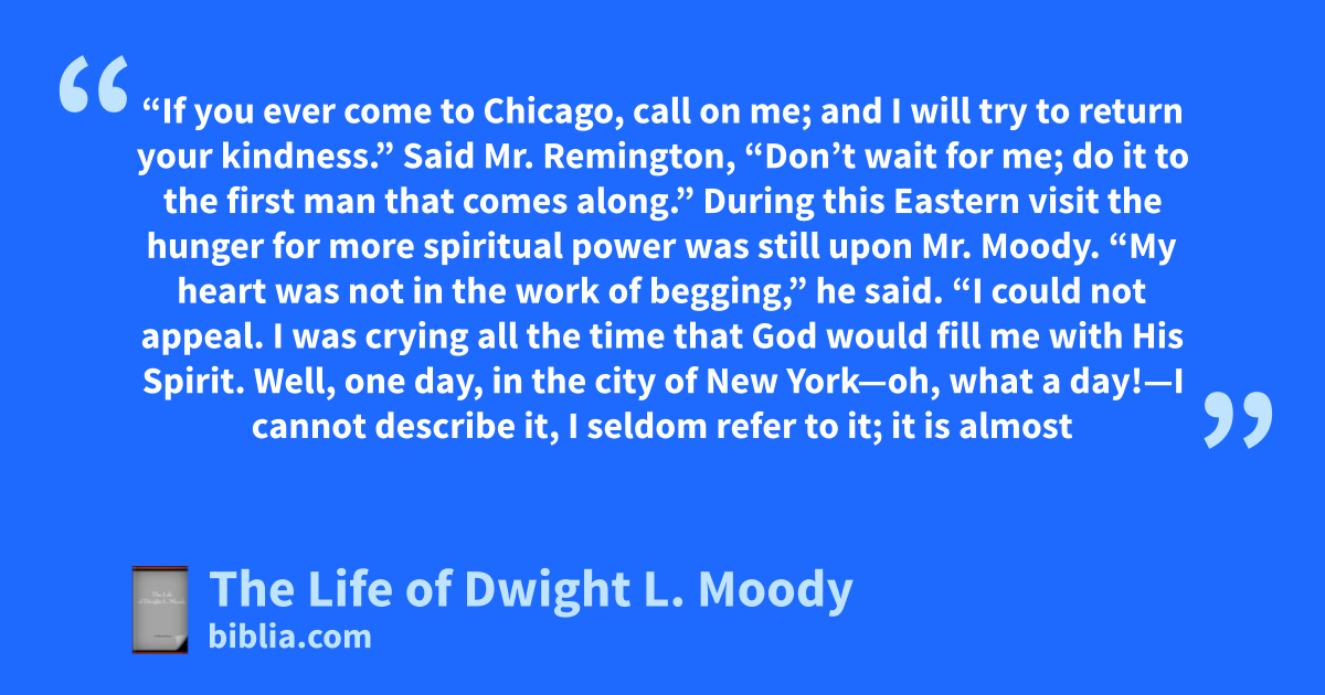 “If you ever come to Chicago, call on me; and I will try to return your kindness.” Said Mr. Remington, “Don’t wait for me; do it to the first man that comes along.” During this Eastern visit the hunger for more spiritual power was still upon Mr. Moody. “My heart was not in the work of begging,” he said. “I could not appeal. I was crying all the time that God would fill me with His Spirit. Well, one day, in the city of New York—oh, what a day!—I cannot describe it, I seldom refer to it; it is almost