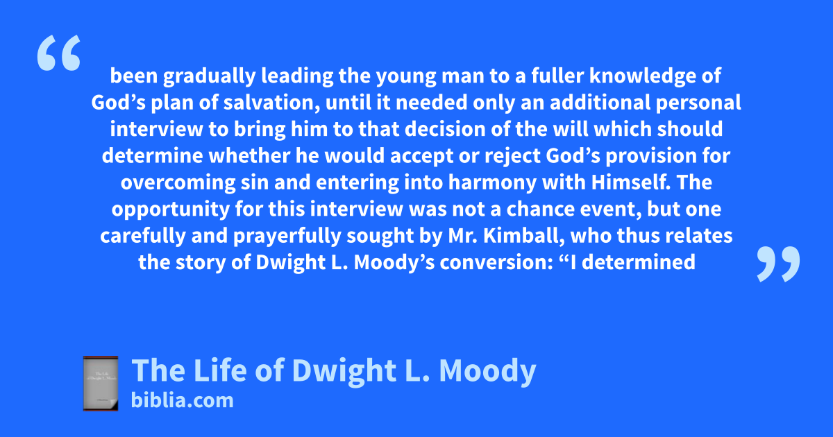been gradually leading the young man to a fuller knowledge of God’s plan of salvation, until it needed only an additional personal interview to bring him to that decision of the will which should determine whether he would accept or reject God’s provision for overcoming sin and entering into harmony with Himself. The opportunity for this interview was not a chance event, but one carefully and prayerfully sought by Mr. Kimball, who thus relates the story of Dwight L. Moody’s conversion: “I determined