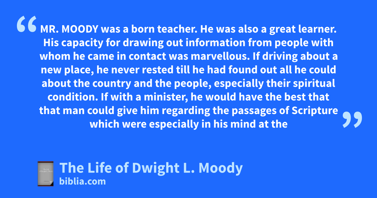 MR. MOODY was a born teacher. He was also a great learner. His capacity for drawing out information from people with whom he came in contact was marvellous. If driving about a new place, he never rested till he had found out all he could about the country and the people, especially their spiritual condition. If with a minister, he would have the best that that man could give him regarding the passages of Scripture which were especially in his mind at the
