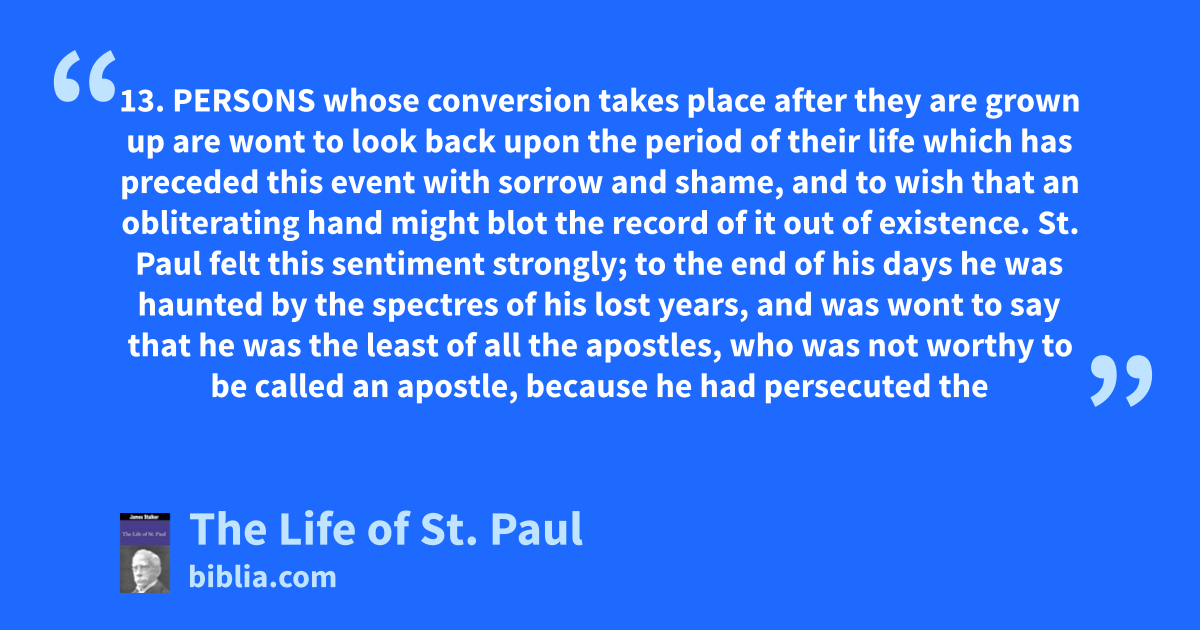 13. PERSONS whose conversion takes place after they are grown up are wont to look back upon the period of their life which has preceded this event with sorrow and shame, and to wish that an obliterating hand might blot the record of it out of existence. St. Paul felt this sentiment strongly; to the end of his days he was haunted by the spectres of his lost years, and was wont to say that he was the least of all the apostles, who was not worthy to be called an apostle, because he had persecuted the