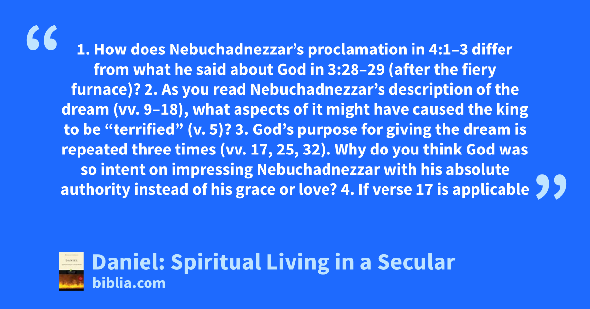 1. How does Nebuchadnezzar’s proclamation in 4:1–3 differ from what he said about God in 3:28–29 (after the fiery furnace)? 2. As you read Nebuchadnezzar’s description of the dream (vv. 9–18), what aspects of it might have caused the king to be “terrified” (v. 5)? 3. God’s purpose for giving the dream is repeated three times (vv. 17, 25, 32). Why do you think God was so intent on impressing Nebuchadnezzar with his absolute authority instead of his grace or love? 4. If verse 17 is applicable