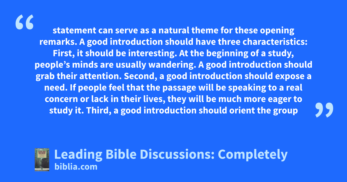 statement can serve as a natural theme for these opening remarks. A good introduction should have three characteristics: First, it should be interesting. At the beginning of a study, people’s minds are usually wandering. A good introduction should grab their attention. Second, a good introduction should expose a need. If people feel that the passage will be speaking to a real concern or lack in their lives, they will be much more eager to study it. Third, a good introduction should orient the group