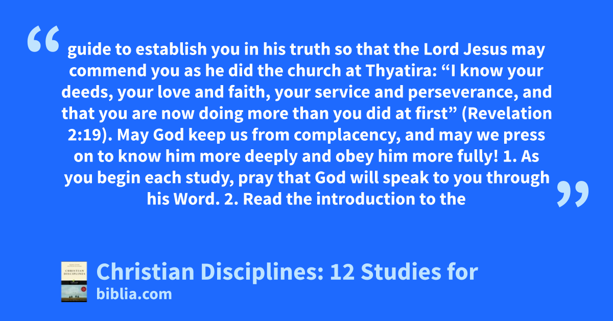 guide to establish you in his truth so that the Lord Jesus may commend you as he did the church at Thyatira: “I know your deeds, your love and faith, your service and perseverance, and that you are now doing more than you did at first” (Revelation 2:19). May God keep us from complacency, and may we press on to know him more deeply and obey him more fully! 1. As you begin each study, pray that God will speak to you through his Word. 2. Read the introduction to the