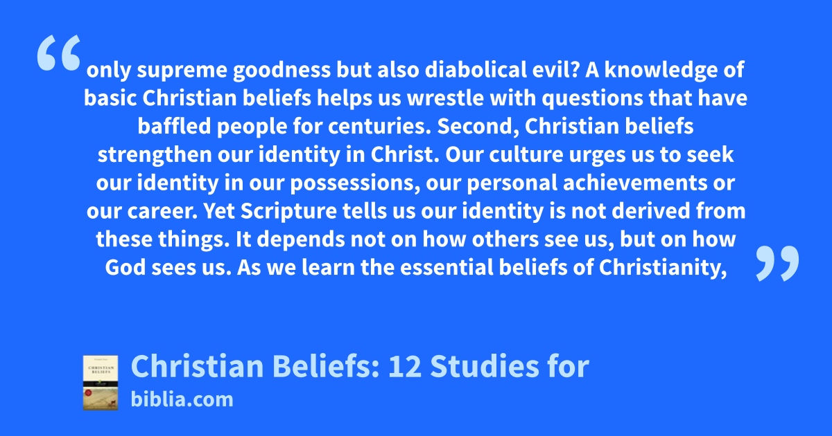 only supreme goodness but also diabolical evil? A knowledge of basic Christian beliefs helps us wrestle with questions that have baffled people for centuries. Second, Christian beliefs strengthen our identity in Christ. Our culture urges us to seek our identity in our possessions, our personal achievements or our career. Yet Scripture tells us our identity is not derived from these things. It depends not on how others see us, but on how God sees us. As we learn the essential beliefs of Christianity,