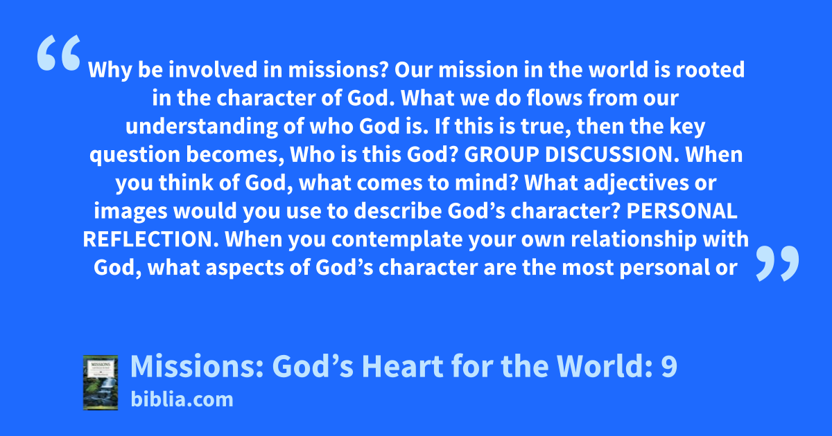 Why be involved in missions? Our mission in the world is rooted in the character of God. What we do flows from our understanding of who God is. If this is true, then the key question becomes, Who is this God? GROUP DISCUSSION. When you think of God, what comes to mind? What adjectives or images would you use to describe God’s character? PERSONAL REFLECTION. When you contemplate your own relationship with God, what aspects of God’s character are the most personal or