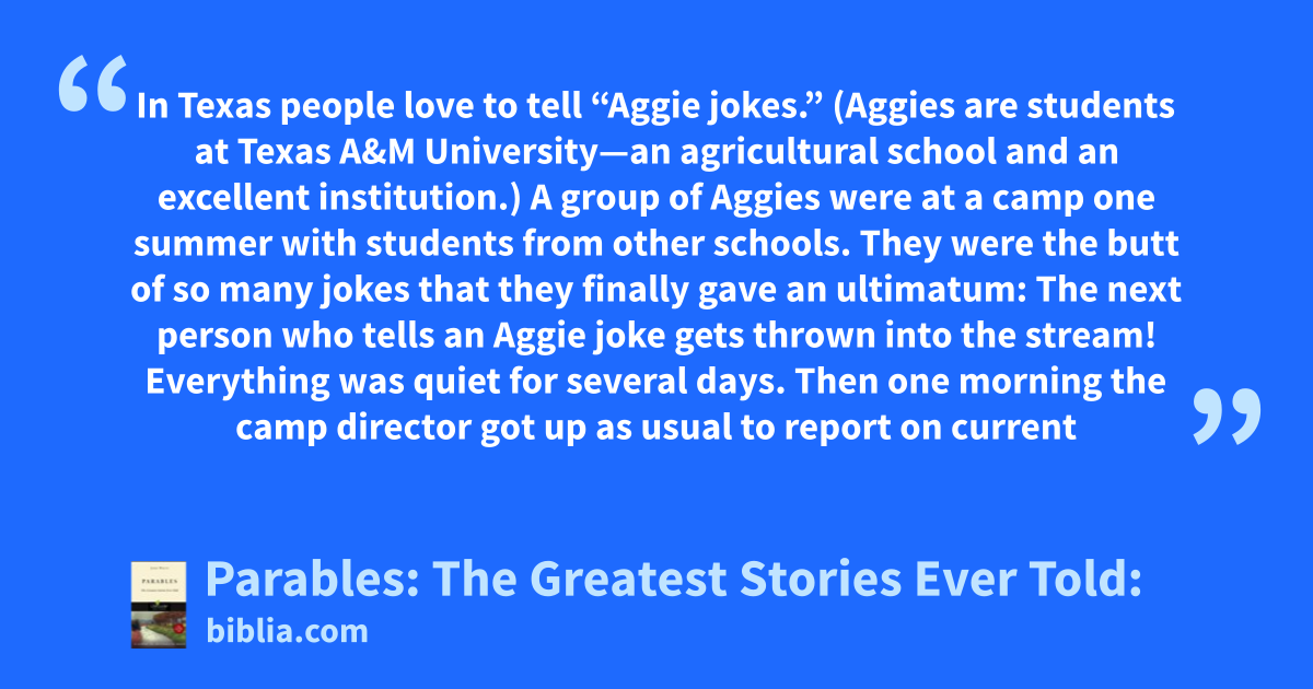 In Texas people love to tell “Aggie jokes.” (Aggies are students at Texas A&M University—an agricultural school and an excellent institution.) A group of Aggies were at a camp one summer with students from other schools. They were the butt of so many jokes that they finally gave an ultimatum: The next person who tells an Aggie joke gets thrown into the stream! Everything was quiet for several days. Then one morning the camp director got up as usual to report on current