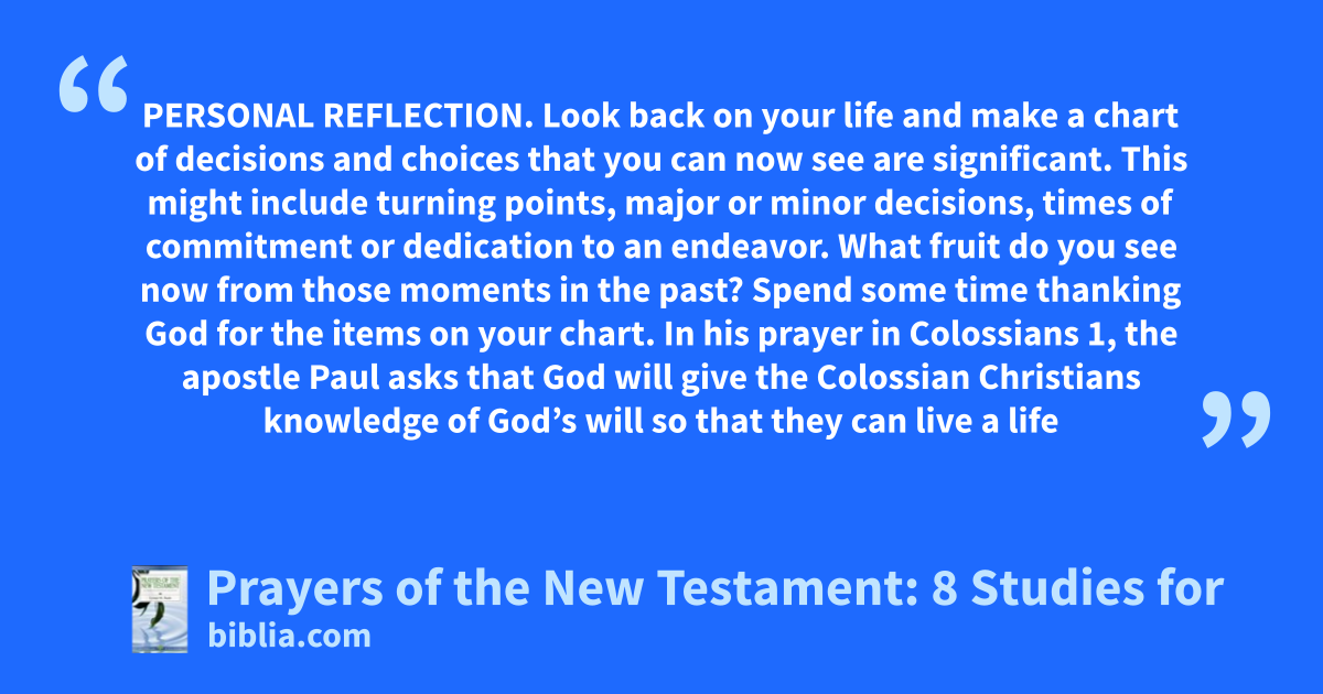 PERSONAL REFLECTION. Look back on your life and make a chart of decisions and choices that you can now see are significant. This might include turning points, major or minor decisions, times of commitment or dedication to an endeavor. What fruit do you see now from those moments in the past? Spend some time thanking God for the items on your chart. In his prayer in Colossians 1, the apostle Paul asks that God will give the Colossian Christians knowledge of God’s will so that they can live a life