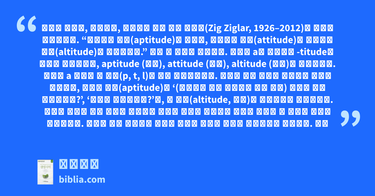 미국의 저술가, 세일즈맨, 동기유발 강사 지그 지글러(Zig Ziglar, 1926–2012)가 이렇게 말했습니다. “여러분의 능력(aptitude)이 아니라, 여러분의 태도(attitude)가 여러분의 고도(altitude)를 결정합니다.” 여기 세 단어가 나옵니다. 알파벳 a로 시작하여 -titude로 끝나는 단어들인데, aptitude (능력), attitude (태도), altitude (고도)가 그것입니다. 이들은 a 다음의 한 글자(p, t, l)만 다른 단어들입니다. 우리는 보통 타고난 능력이든 획득한 능력이든, 자신의 능력(aptitude)이 ‘(사회적인 혹은 경제적인 지위 등이) 얼마나 높이 올라가느냐?’, ‘얼마나 성공하느냐?’를, 즉 고도(altitude, 高度)를 결정한다고 생각합니다. 공부를 잘해서 어떤 분야에 전문성을 갖거나 기술을 연마하여 실력을 갖추면 큰 인물이 된다고 생각합니다. 그런데 지그 지글러는 실력이 아니라 태도가 고도를 결정한다고 했습니다. 지글