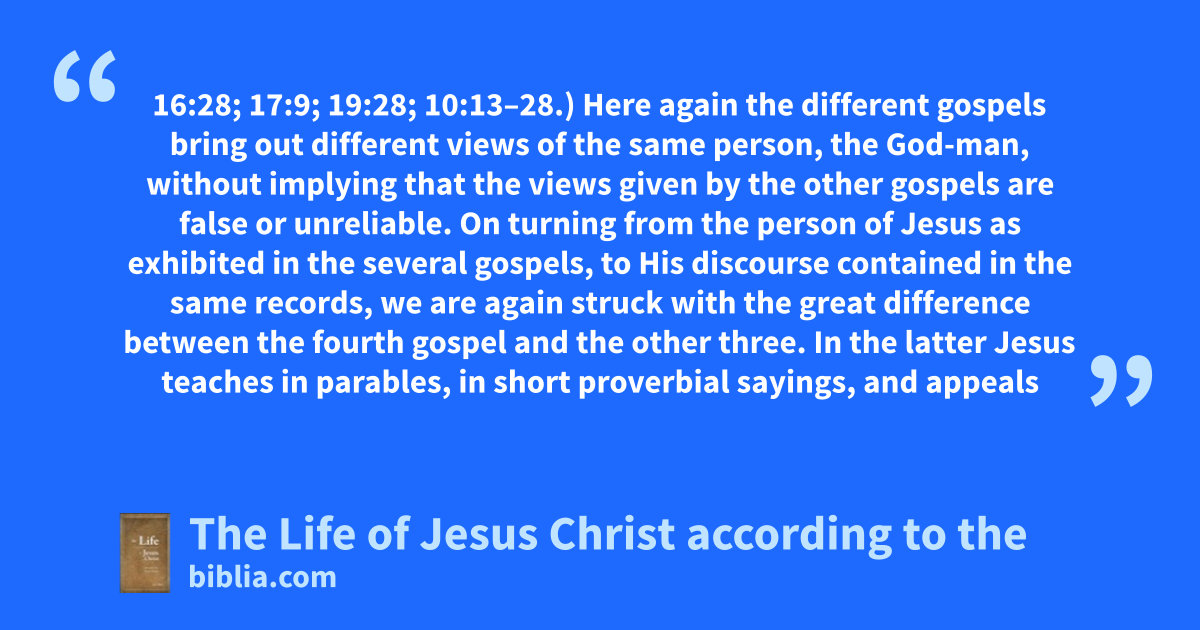 16:28; 17:9; 19:28; 10:13–28.) Here again the different gospels bring out different views of the same person, the God-man, without implying that the views given by the other gospels are false or unreliable. On turning from the person of Jesus as exhibited in the several gospels, to His discourse contained in the same records, we are again struck with the great difference between the fourth gospel and the other three. In the latter Jesus teaches in parables, in short proverbial sayings, and appeals