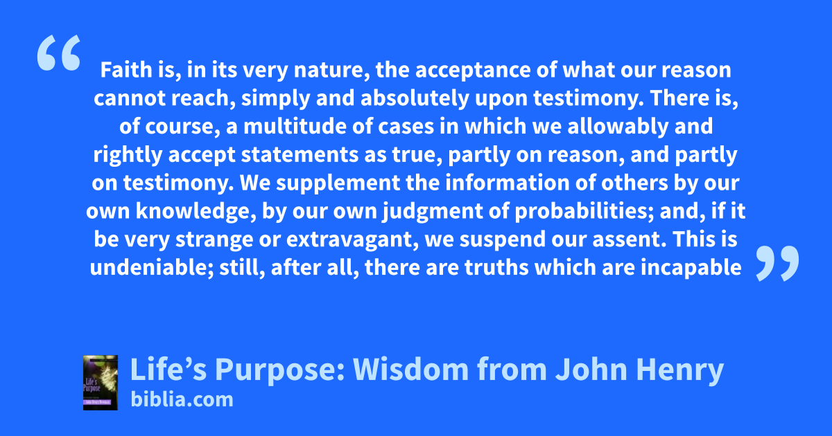 Faith is, in its very nature, the acceptance of what our reason cannot reach, simply and absolutely upon testimony. There is, of course, a multitude of cases in which we allowably and rightly accept statements as true, partly on reason, and partly on testimony. We supplement the information of others by our own knowledge, by our own judgment of probabilities; and, if it be very strange or extravagant, we suspend our assent. This is undeniable; still, after all, there are truths which are incapable