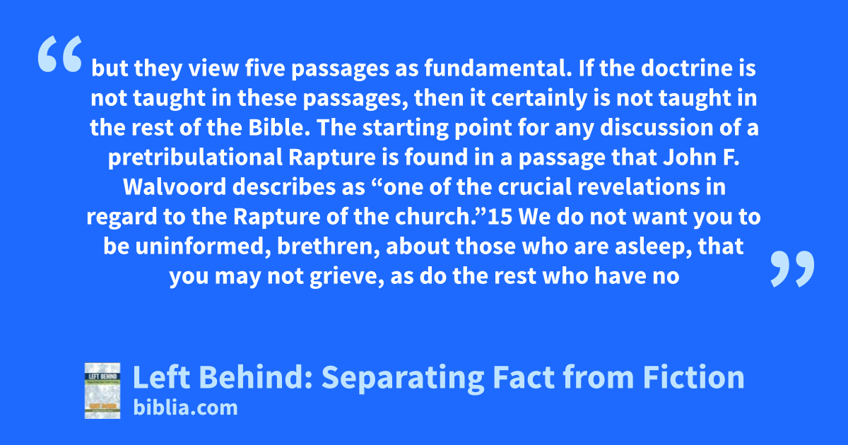 Will anyone actually be left behind? You might think so, if you've read Tim LaHaye's Left Behind series (written with Jerry Jenkins). You can be convinced that the Bible specifically teaches that in the end times Christians will be rescued from a terrible seven-year tribulation period while unbelievers will remain on earth to be subjected to countless horrors at the hands of the antichrist. In...