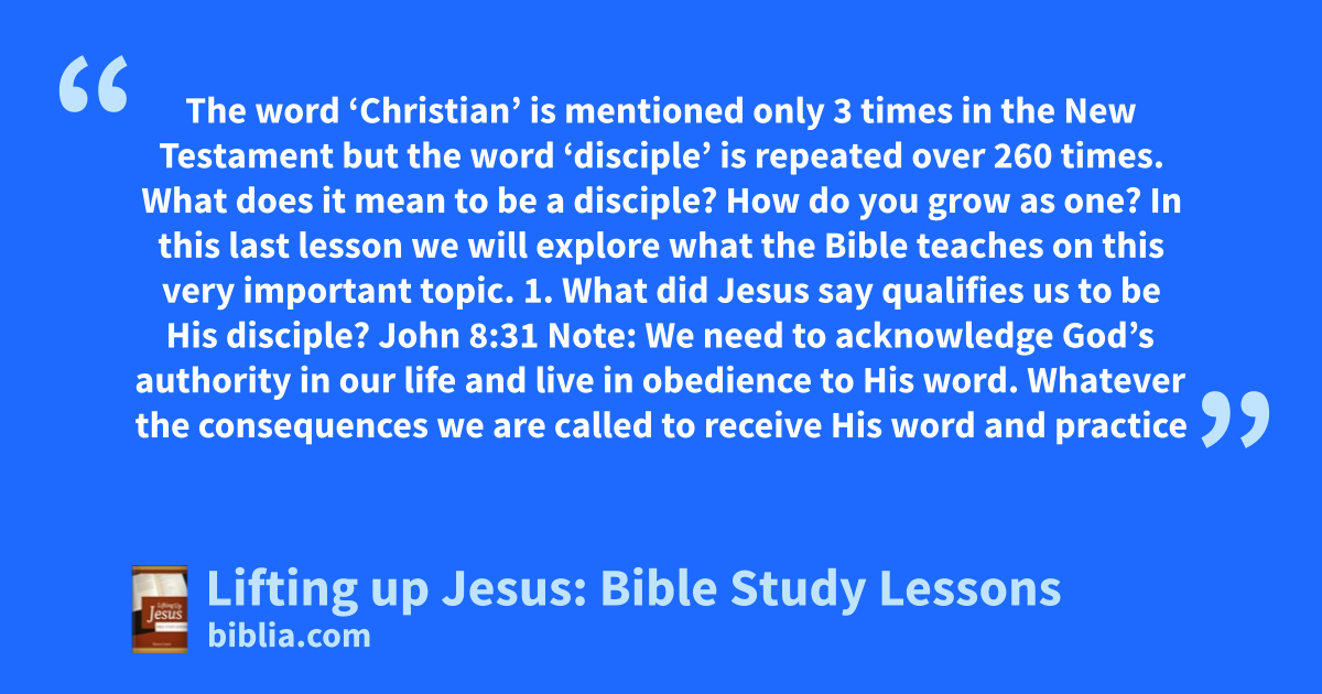 The word ‘Christian’ is mentioned only 3 times in the New Testament but the word ‘disciple’ is repeated over 260 times. What does it mean to be a disciple? How do you grow as one? In this last lesson we will explore what the Bible teaches on this very important topic. 1. What did Jesus say qualifies us to be His disciple? John 8:31 Note: We need to acknowledge God’s authority in our life and live in obedience to His word. Whatever the consequences we are called to receive His word and practice