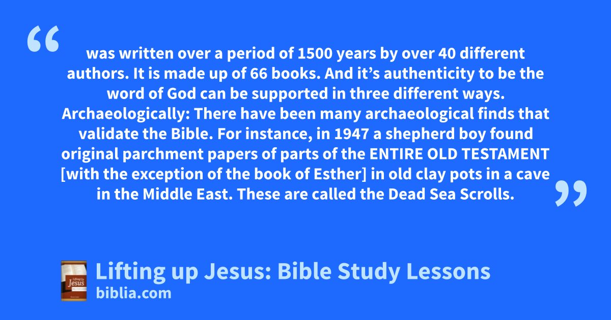 was written over a period of 1500 years by over 40 different authors. It is made up of 66 books. And it’s authenticity to be the word of God can be supported in three different ways. Archaeologically: There have been many archaeological finds that validate the Bible. For instance, in 1947 a shepherd boy found original parchment papers of parts of the ENTIRE OLD TESTAMENT [with the exception of the book of Esther] in old clay pots in a cave in the Middle East. These are called the Dead Sea Scrolls.