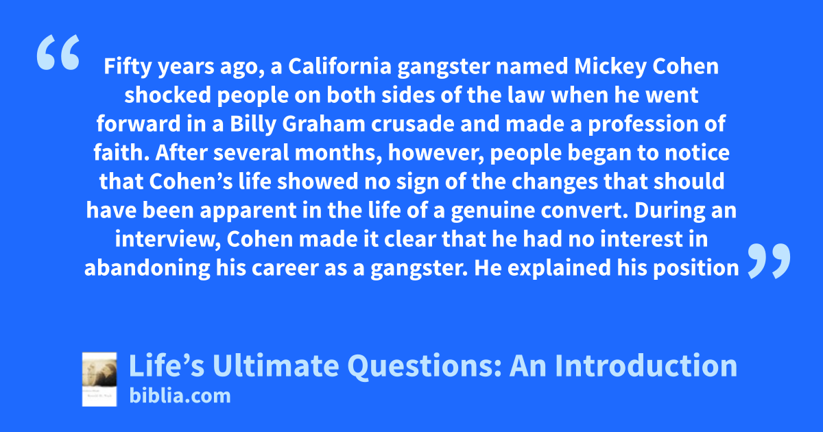 Fifty years ago, a California gangster named Mickey Cohen shocked people on both sides of the law when he went forward in a Billy Graham crusade and made a profession of faith. After several months, however, people began to notice that Cohen’s life showed no sign of the changes that should have been apparent in the life of a genuine convert. During an interview, Cohen made it clear that he had no interest in abandoning his career as a gangster. He explained his position