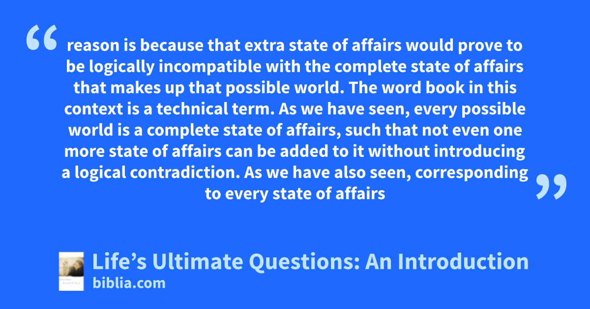 reason is because that extra state of affairs would prove to be logically incompatible with the complete state of affairs that makes up that possible world. The word book in this context is a technical term. As we have seen, every possible world is a complete state of affairs, such that not even one more state of affairs can be added to it without introducing a logical contradiction. As we have also seen, corresponding to every state of affairs