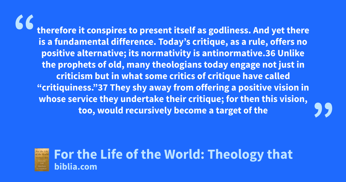 therefore it conspires to present itself as godliness. And yet there is a fundamental difference. Today’s critique, as a rule, offers no positive alternative; its normativity is antinormative.36 Unlike the prophets of old, many theologians today engage not just in criticism but in what some critics of critique have called “critiquiness.”37 They shy away from offering a positive vision in whose service they undertake their critique; for then this vision, too, would recursively become a target of the
