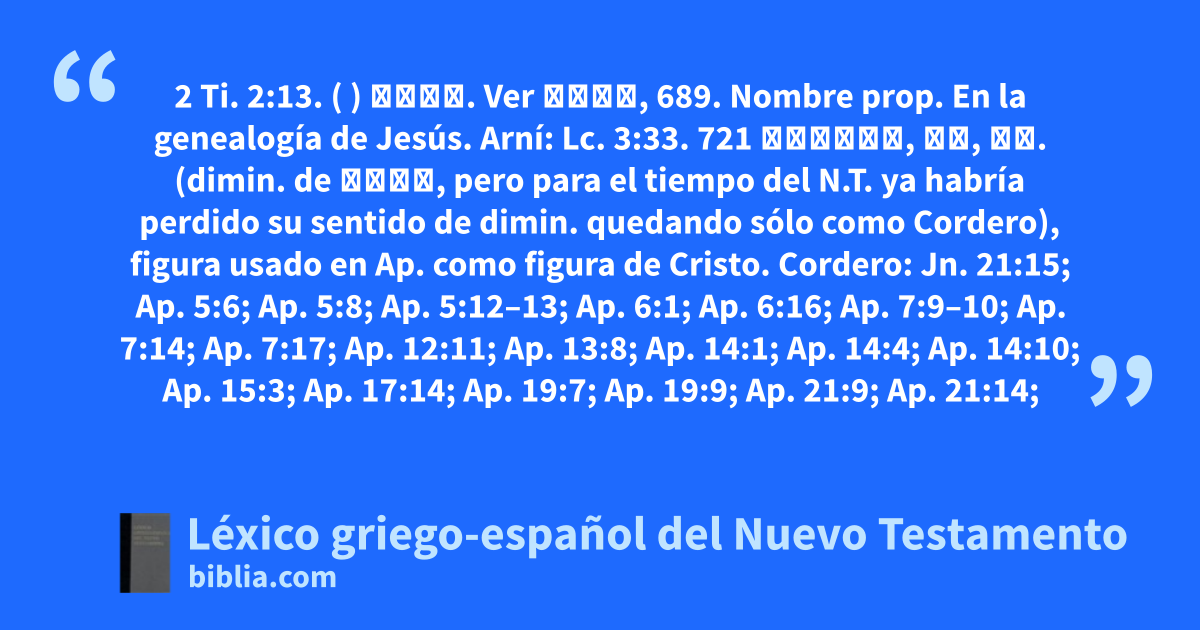 2 Ti. 2:13. ( ) Ἀρνί. Ver Ἀράμ, 689. Nombre prop. En la genealogía de Jesús. Arní: Lc. 3:33. 721 ἀρνίον, ου, τό. (dimin. de ἀρήν, pero para el tiempo del N.T. ya habría perdido su sentido de dimin. quedando sólo como Cordero), figura usado en Ap. como figura de Cristo. Cordero: Jn. 21:15; Ap. 5:6; Ap. 5:8; Ap. 5:12–13; Ap. 6:1; Ap. 6:16; Ap. 7:9–10; Ap. 7:14; Ap. 7:17; Ap. 12:11; Ap. 13:8; Ap. 14:1; Ap. 14:4; Ap. 14:10; Ap. 15:3; Ap. 17:14; Ap. 19:7; Ap. 19:9; Ap. 21:9; Ap. 21:14;