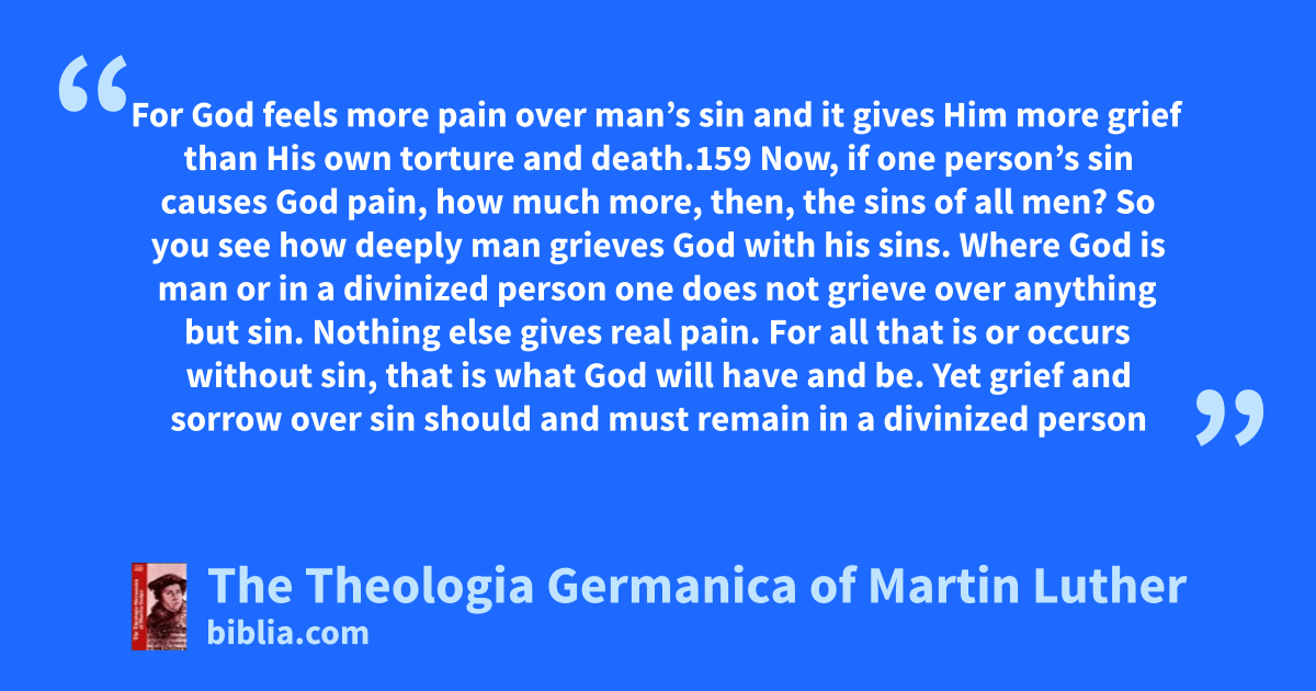 For God feels more pain over man’s sin and it gives Him more grief than His own torture and death.159 Now, if one person’s sin causes God pain, how much more, then, the sins of all men? So you see how deeply man grieves God with his sins. Where God is man or in a divinized person one does not grieve over anything but sin. Nothing else gives real pain. For all that is or occurs without sin, that is what God will have and be. Yet grief and sorrow over sin should and must remain in a divinized person