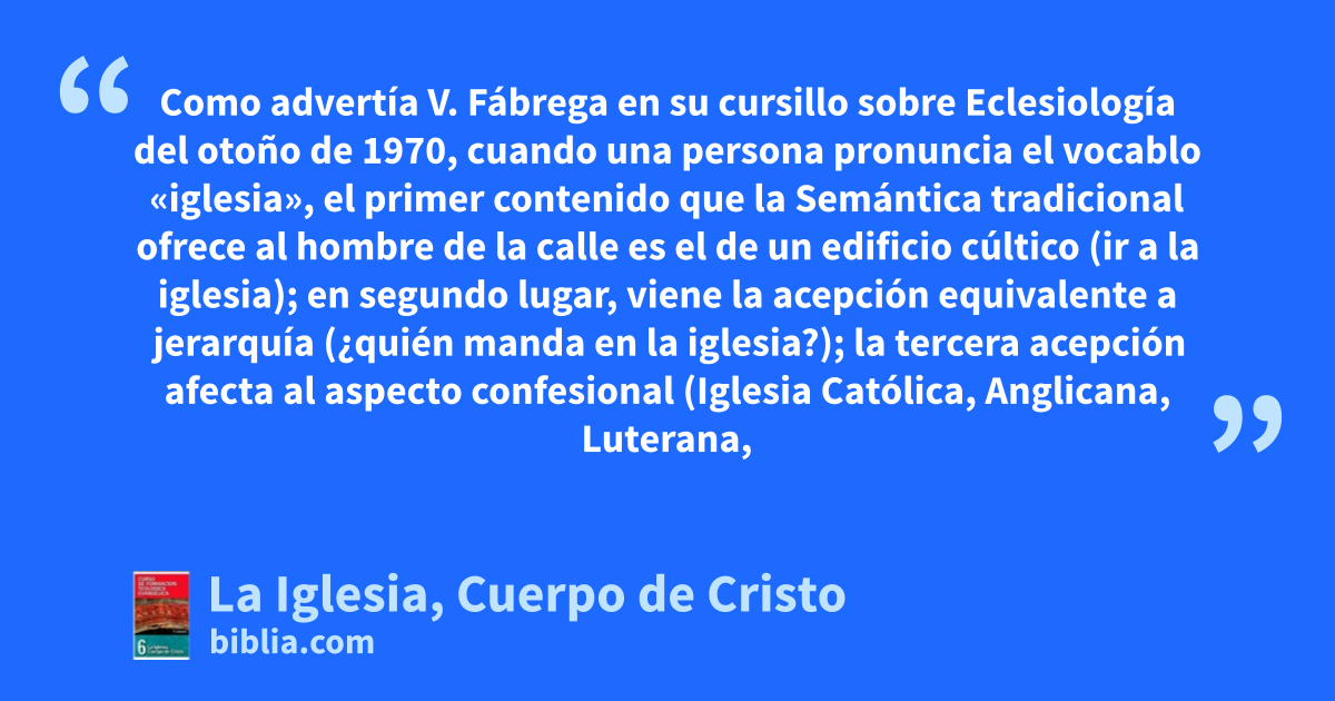 Como advertía V. Fábrega en su cursillo sobre Eclesiología del otoño de 1970, cuando una persona pronuncia el vocablo «iglesia», el primer contenido que la Semántica tradicional ofrece al hombre de la calle es el de un edificio cúltico (ir a la iglesia); en segundo lugar, viene la acepción equivalente a jerarquía (¿quién manda en la iglesia?); la tercera acepción afecta al aspecto confesional (Iglesia Católica, Anglicana, Luterana,
