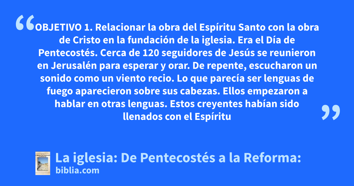 OBJETIVO 1. Relacionar la obra del Espíritu Santo con la obra de Cristo en la fundación de la iglesia. Era el Día de Pentecostés. Cerca de 120 seguidores de Jesús se reunieron en Jerusalén para esperar y orar. De repente, escucharon un sonido como un viento recio. Lo que parecía ser lenguas de fuego aparecieron sobre sus cabezas. Ellos empezaron a hablar en otras lenguas. Estos creyentes habían sido llenados con el Espíritu