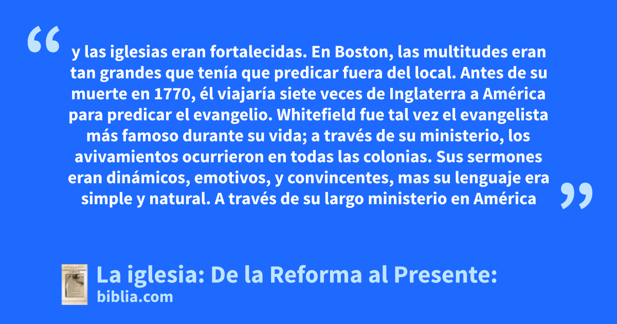 y las iglesias eran fortalecidas. En Boston, las multitudes eran tan grandes que tenía que predicar fuera del local. Antes de su muerte en 1770, él viajaría siete veces de Inglaterra a América para predicar el evangelio. Whitefield fue tal vez el evangelista más famoso durante su vida; a través de su ministerio, los avivamientos ocurrieron en todas las colonias. Sus sermones eran dinámicos, emotivos, y convincentes, mas su lenguaje era simple y natural. A través de su largo ministerio en América