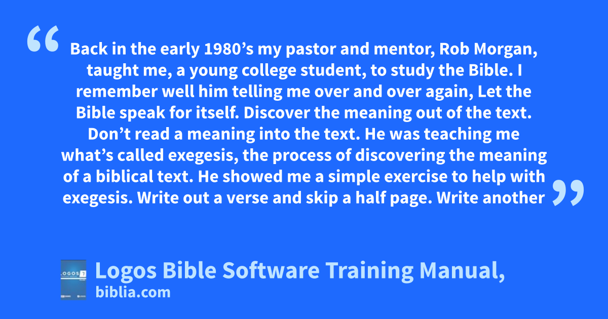 Back in the early 1980’s my pastor and mentor, Rob Morgan, taught me, a young college student, to study the Bible. I remember well him telling me over and over again, Let the Bible speak for itself. Discover the meaning out of the text. Don’t read a meaning into the text. He was teaching me what’s called exegesis, the process of discovering the meaning of a biblical text. He showed me a simple exercise to help with exegesis. Write out a verse and skip a half page. Write another