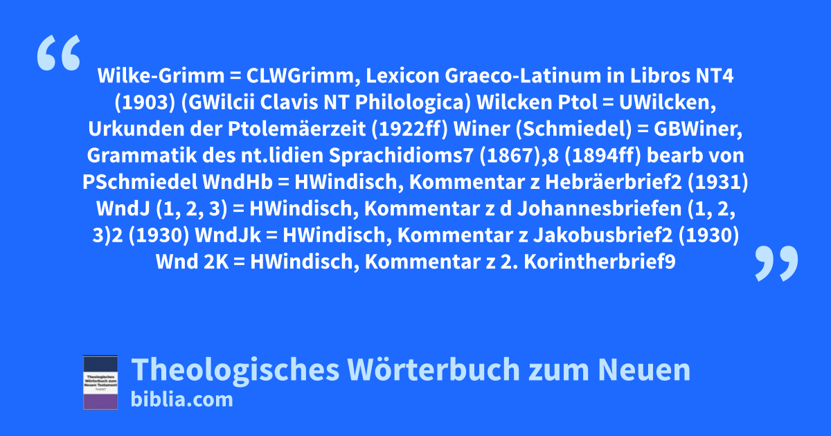 Wilke-Grimm = CLWGrimm, Lexicon Graeco-Latinum in Libros NT4 (1903) (GWilcii Clavis NT Philologica) Wilcken Ptol = UWilcken, Urkunden der Ptolemäerzeit (1922ff) Winer (Schmiedel) = GBWiner, Grammatik des nt.lidien Sprachidioms7 (1867),8 (1894ff) bearb von PSchmiedel WndHb = HWindisch, Kommentar z Hebräerbrief2 (1931) WndJ (1, 2, 3) = HWindisch, Kommentar z d Johannesbriefen (1, 2, 3)2 (1930) WndJk = HWindisch, Kommentar z Jakobusbrief2 (1930) Wnd 2K = HWindisch, Kommentar z 2. Korintherbrief9