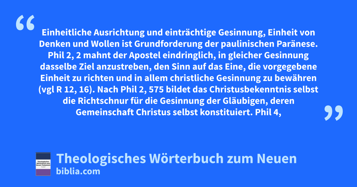 Einheitliche Ausrichtung und einträchtige Gesinnung, Einheit von Denken und Wollen ist Grundforderung der paulinischen Paränese. Phil 2, 2 mahnt der Apostel eindringlich, in gleicher Gesinnung dasselbe Ziel anzustreben, den Sinn auf das Eine, die vorgegebene Einheit zu richten und in allem christliche Gesinnung zu bewähren (vgl R 12, 16). Nach Phil 2, 575 bildet das Christusbekenntnis selbst die Richtschnur für die Gesinnung der Gläubigen, deren Gemeinschaft Christus selbst konstituiert. Phil 4,