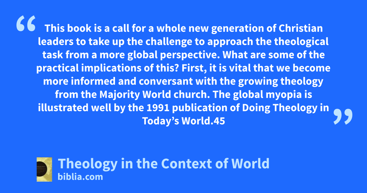 This book is a call for a whole new generation of Christian leaders to take up the challenge to approach the theological task from a more global perspective. What are some of the practical implications of this? First, it is vital that we become more informed and conversant with the growing theology from the Majority World church. The global myopia is illustrated well by the 1991 publication of Doing Theology in Today’s World.45