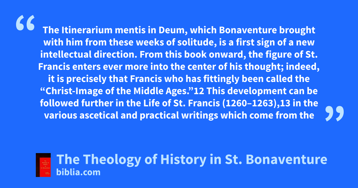 The Itinerarium mentis in Deum, which Bonaventure brought with him from these weeks of solitude, is a first sign of a new intellectual direction. From this book onward, the figure of St. Francis enters ever more into the center of his thought; indeed, it is precisely that Francis who has fittingly been called the “Christ-Image of the Middle Ages.”12 This development can be followed further in the Life of St. Francis (1260–1263),13 in the various ascetical and practical writings which come from the
